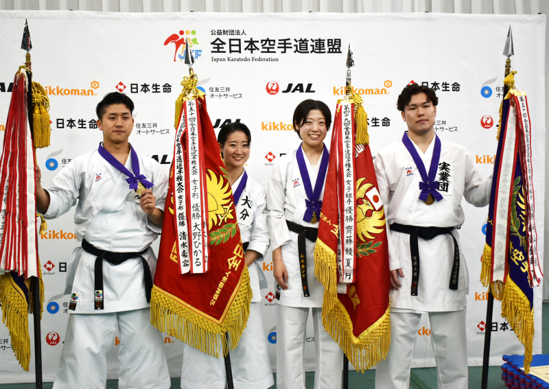 今大会の優勝者、(左から)男子個人形の西山走、女子個人形の大野ひかる、女子個人組手の永井カンナ、男子個人組手の安藤大騎