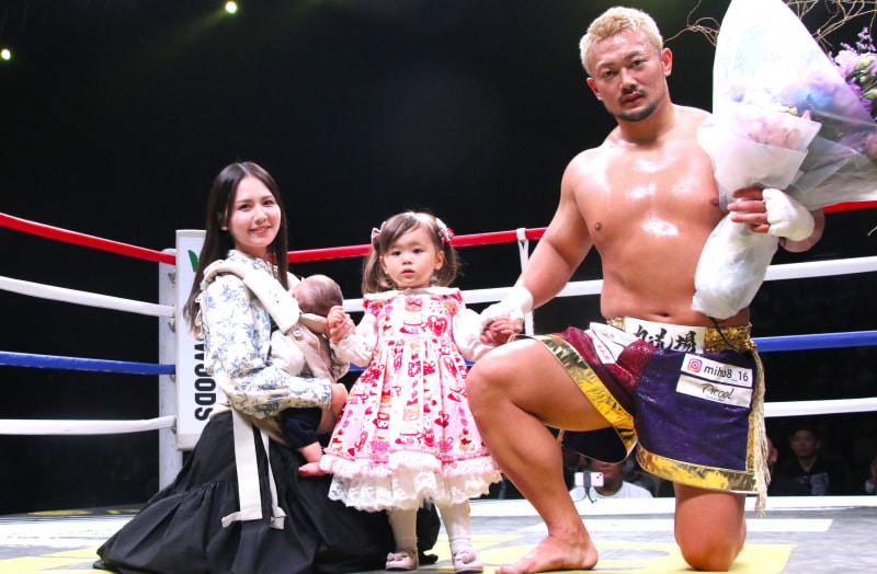 愛鷹(右)と、妻で元AKB48メンバーの佐藤すみれ(左)、2人の子どもたち(23年12月)