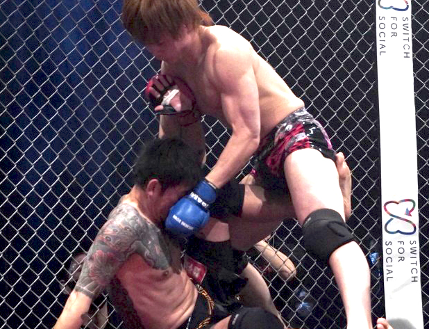 啓之輔の顔にパンチを打ち込む井土(22年3月)