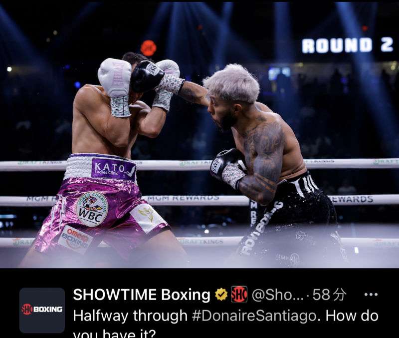 飛び込むようなサンティアゴ(右)のパンチがヒットする(@Showtimrboxing)
