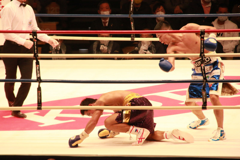 中谷のパンチにマットに崩れ落ちるマグラモ
