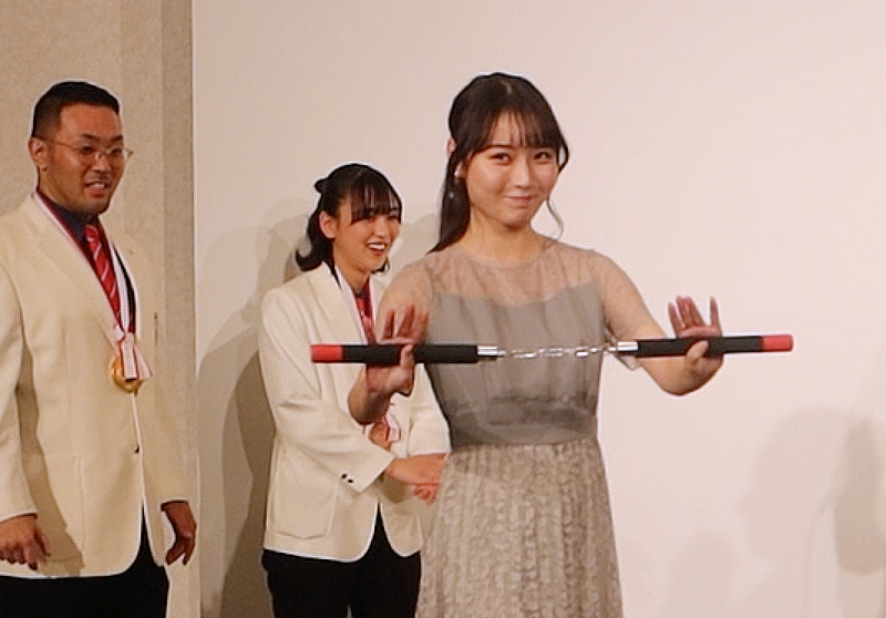 左から世界優勝の入来建武、世界女子3位の目代結菜、ヌンチャクを持つ安井南