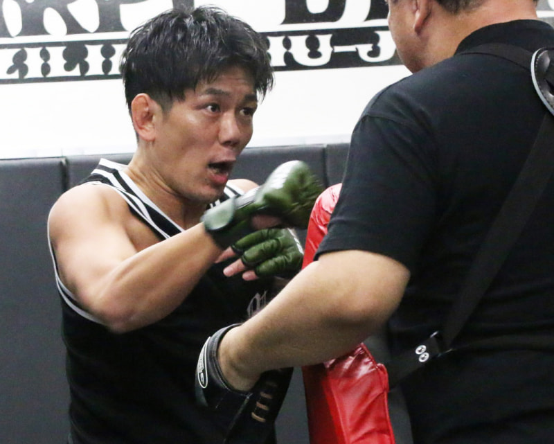 真剣な表情でミットにパンチをたたき込む皇治