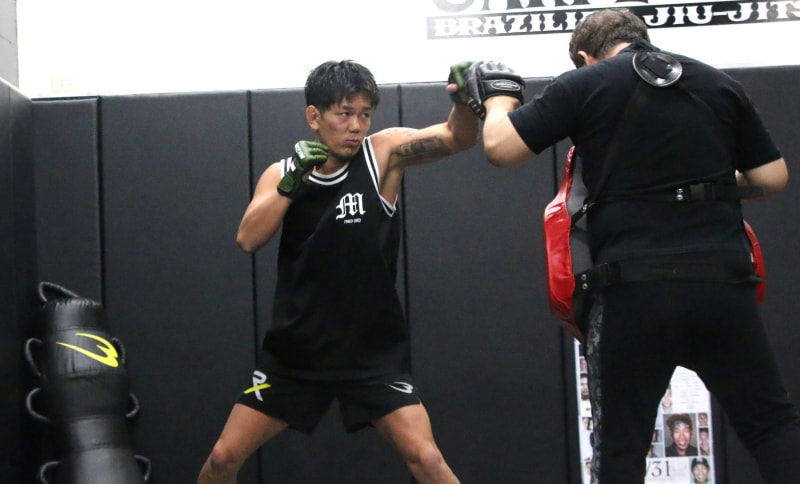 「こんなグローブで殴ったら倒れる」と皇治は、鋭いパンチを披露した