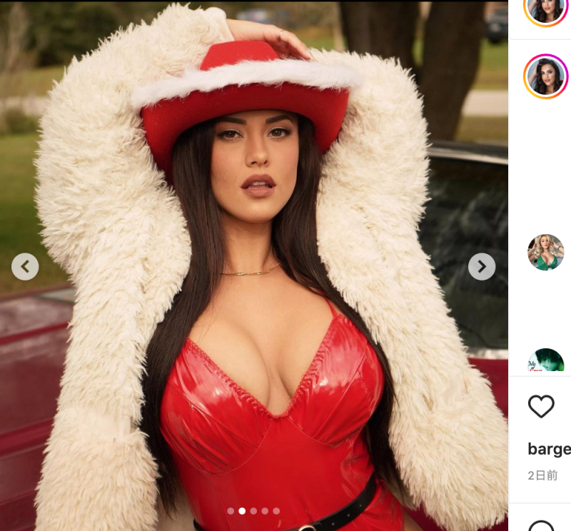 赤のクラシックカーの前でセクシーなサンタ姿@missamberfieldより