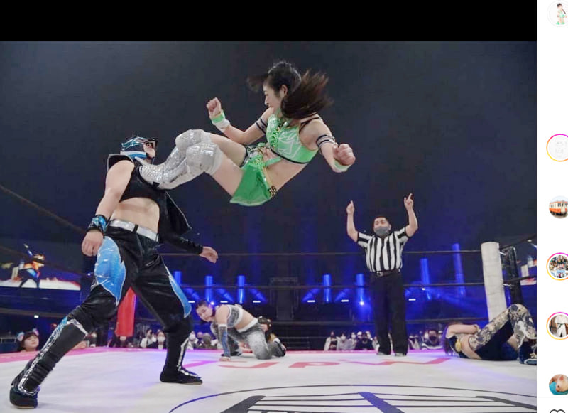 プロレスでドロップキックを決める鈴木志乃(@uug_p_shino)