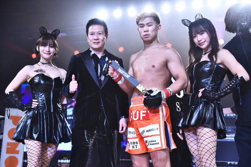 今年11月のFIGHT CLUBでラウンドガールを務めた左は高橋凛、右は桜りん。中央はメインで朝倉未来に勝利したYA-MAN(c)RISE