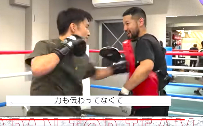 朝倉(左)は佐々木トレーナーの下でパンチを習う(『JTT(JAPANTOPTEAM)公式チャンネル』)