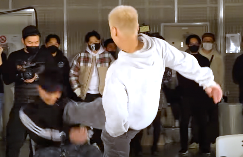 こめおの蹴りを受けて転倒する山川(『朝倉未来』YouTubeチャンネル)