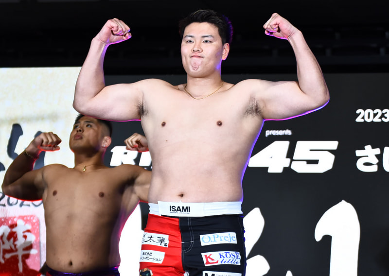 上田がマッスルポーズ、後ろにいるスダリオもマッスル!