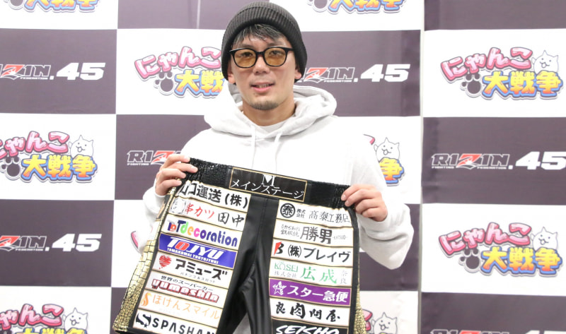 使用したキックパンツを手に勝利を喜ぶ皇治