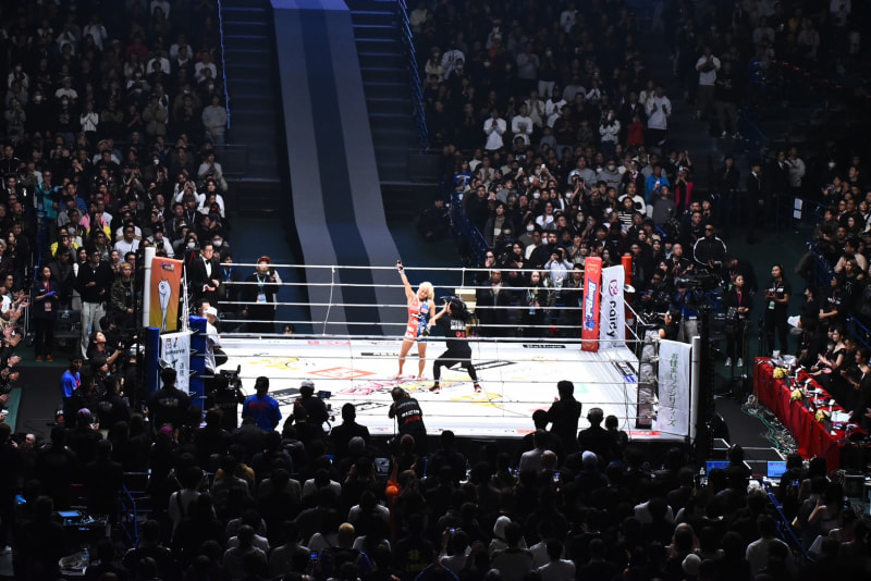 最後の10カウントゴングと選手コールを聞く山本