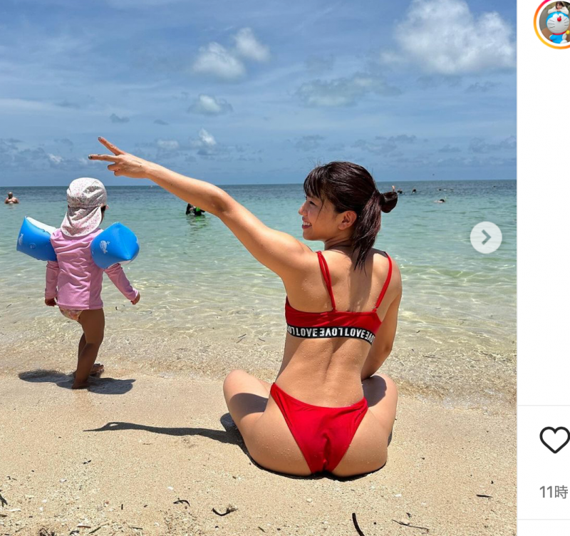 赤ビキニでグリーン島の砂浜に座ったぱんちゃん(@panchanrinaより)