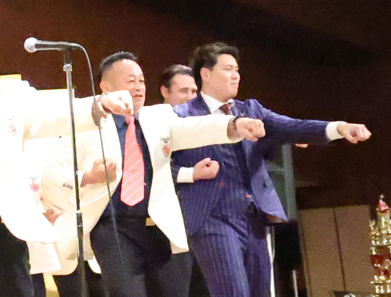 全員で正拳突きする緑代表、右は大みそかにスダリオ剛にKO勝ちした上田幹雄