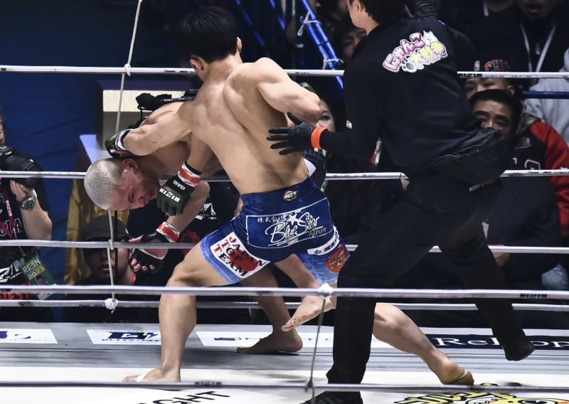 ハイキックを受けてバランスを崩した新井に、ヒロヤは右のパンチを叩き込む