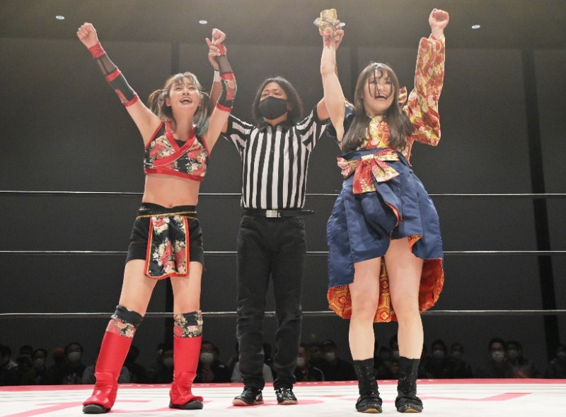 23年1月、タッグで勝利した長野じゅりあ(左)と宮本もか(右)
