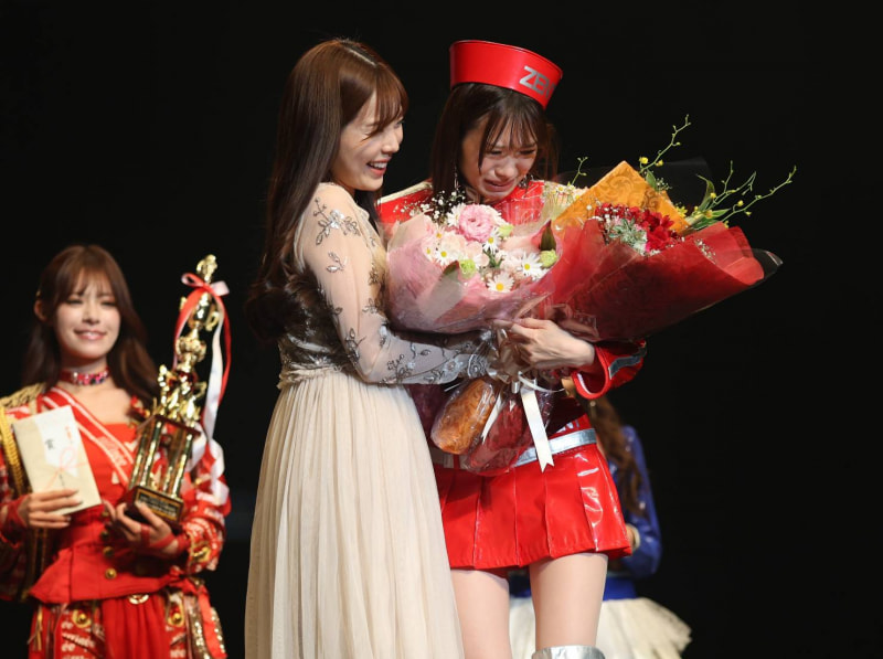 サプライズで駆けつけた川村(左)、花束を受け取った松田は嬉し涙