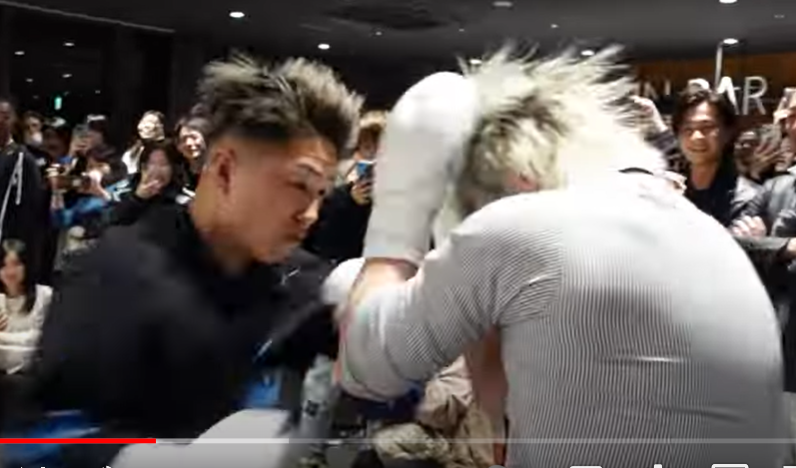 悪童レオのパンチをガードの上から受けるジョリー(『安保瑠輝也チャンネル』)