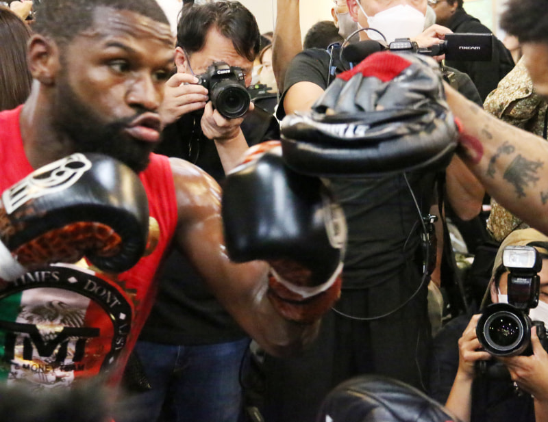 メイウェザーは素早いショートアッパーをミット打ちで披露した(朝倉未来戦前)