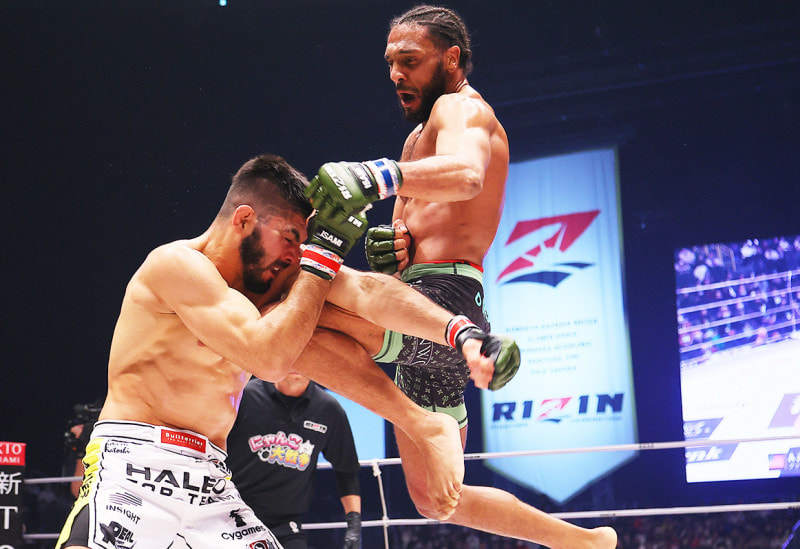 22年大みそかRIZINとの対抗戦でサトシに飛びヒザ蹴りを放つAJマッキー©️RIZIN