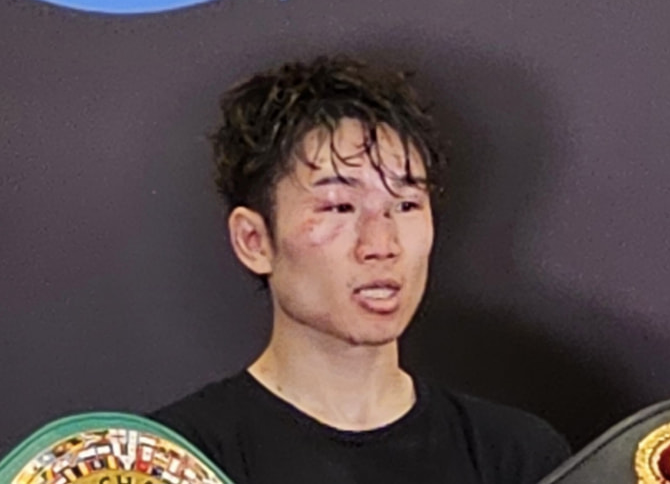 試合後会見に挑んだ寺地、僅差勝利で被弾多く、顔に多くの傷をつけた