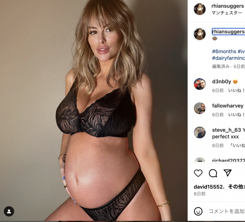リアン・サグデン(37)に待望の第一子、黒のブラと大きなお腹を見せ話題に(@rhiansuggersより)