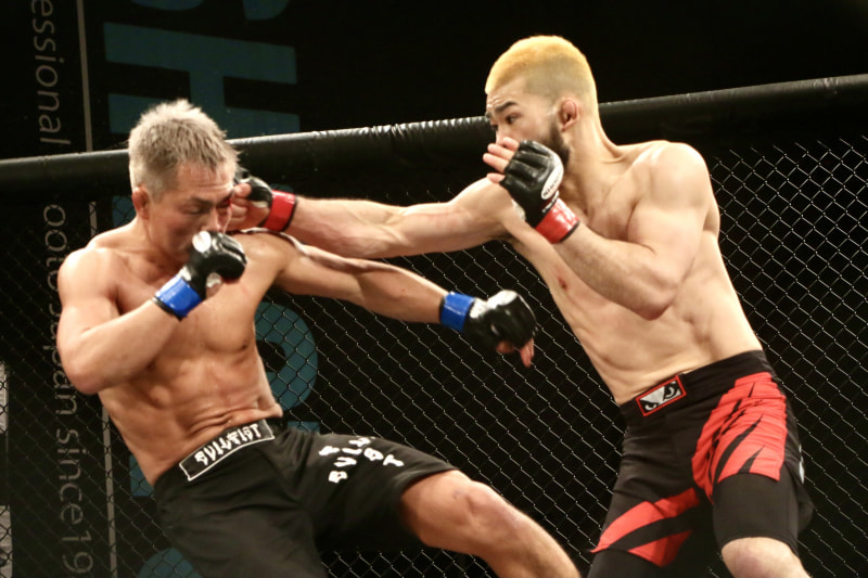 TOMA(右)が齋藤(左)に右フックでダウン奪取、そのままTKO勝利した