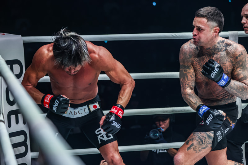 ホルツケンの強打を浴びる秋山(左)©︎ONE Championship