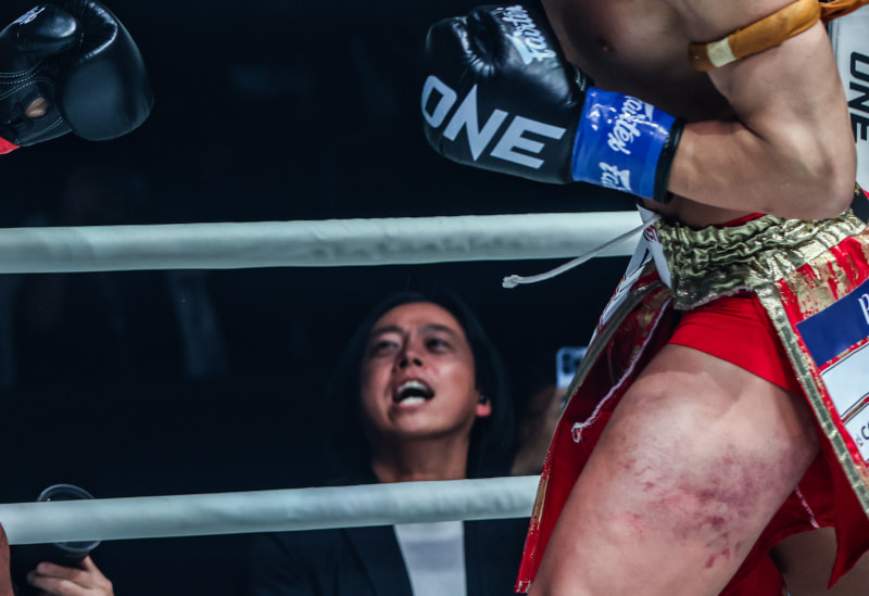 試合中でも、武尊の太ももがドス黒く腫れ上がっている(c)ONE