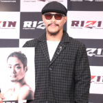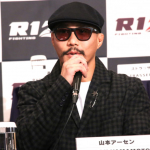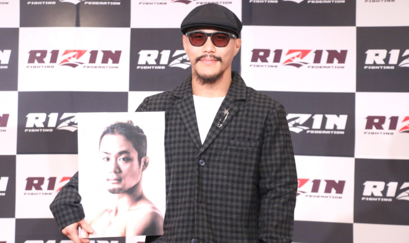 山本アーセンは対戦する柴田“MONKEY”有哉のパネルを片手に笑顔
