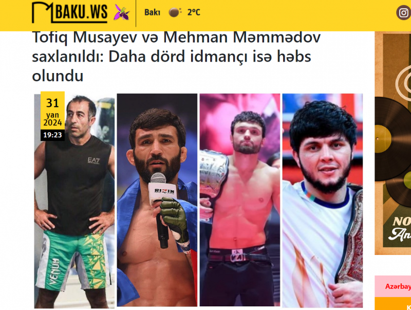 アゼルバイジャンの現地メディアが逮捕を報道。右からムサエフ、ケラモフ、マメドフ、コーチ(『BAKU.WS』ホームページより)