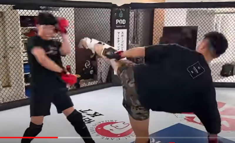 山崎は得意の掛け蹴りを軽く合わせる(『ふわっとmikuruチャンネル』)
