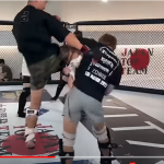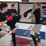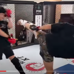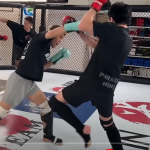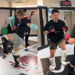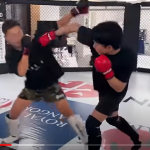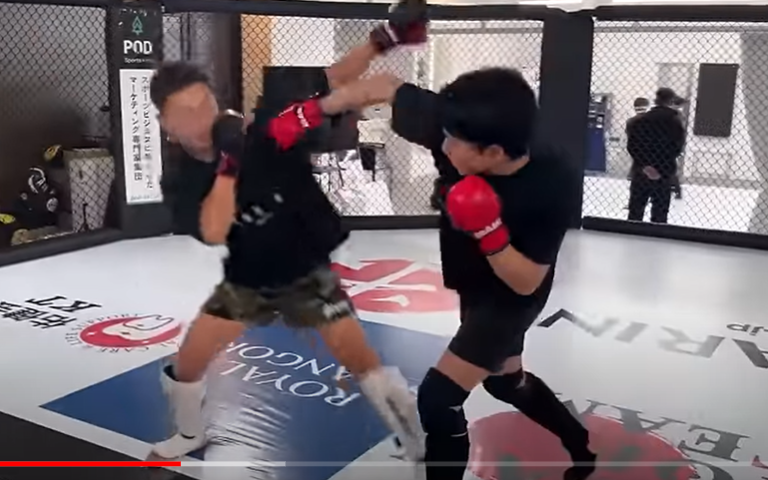 朝倉(右)は右のパンチで果敢に山崎(左)に攻め込む(『ふわっとmikuruチャンネル』)