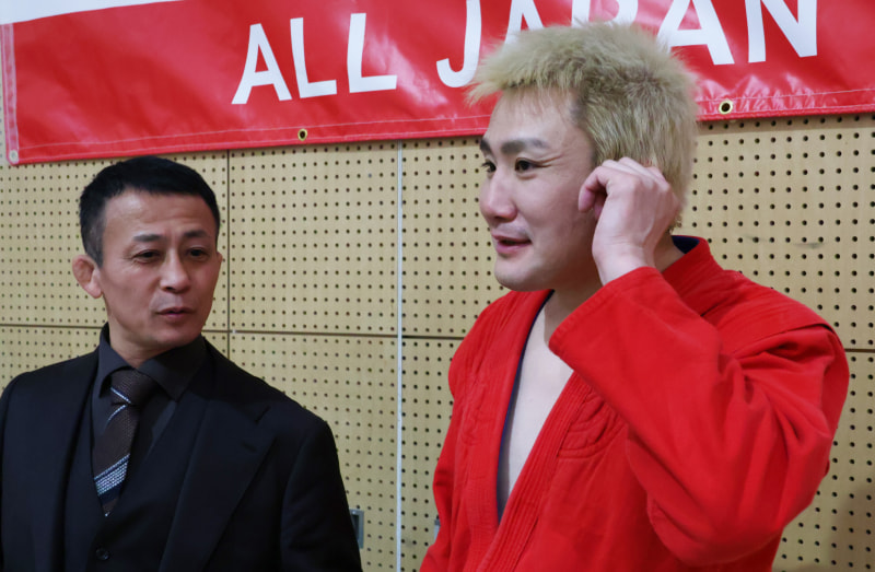 試合後インタビューに応じる五味(右)、左が五木田勝氏