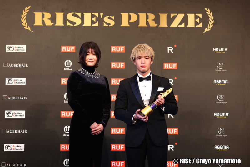 MVP賞に輝いた田丸辰(右)と、プレゼンターの真木よう子