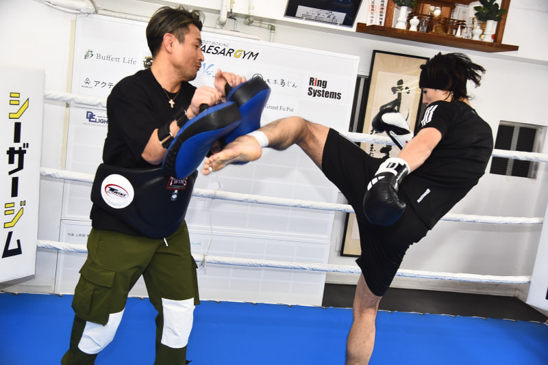 ミットを持つ魔裟斗、海人はミドルキックを蹴り込む©︎SHOOT BOXING