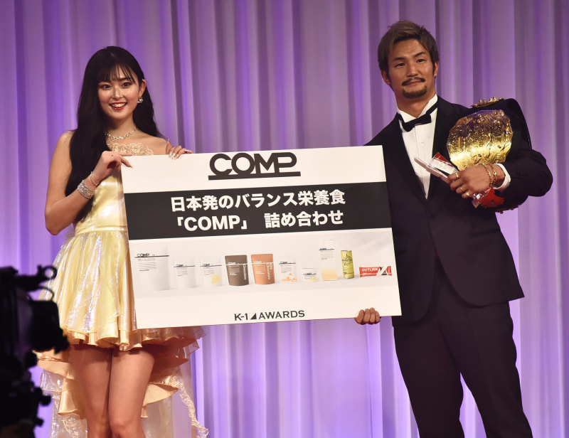 松倉信太郎(右)へのプレゼンターを務めた、ゆうちゃみ(左)