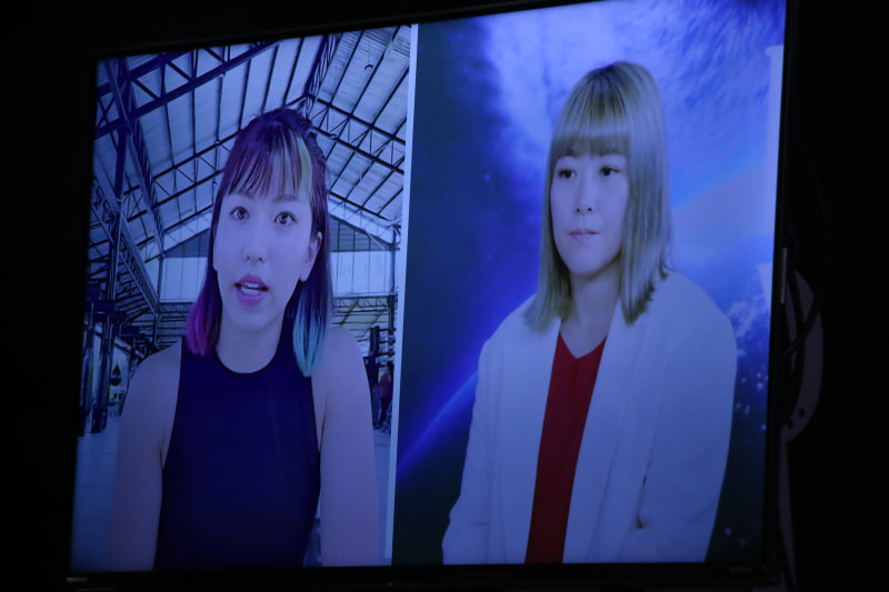 ぱんちゃん(左)はリモートで会見に参加、右は平岡琴
