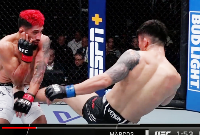 再開後、今度はチロンの蹴りがマルコスの下腹部に(@UFC JAPAN)