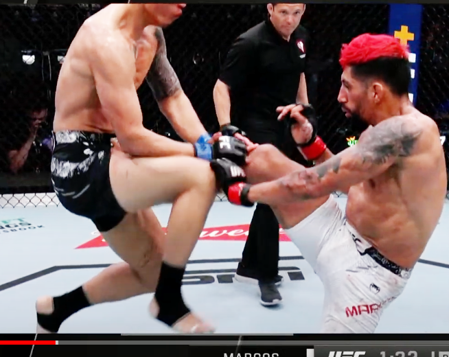 最後は、チロンの飛びヒザにカウンターの前蹴りが股間を強襲(@UFC JAPAN)