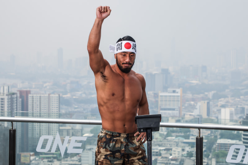 日の丸の鉢巻きで右拳を突き上げる手塚©️ONE