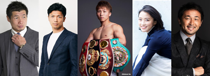 今回の解説やMC、左から長谷川穂積、村田諒太、井上尚弥、竹内由恵、山中慎介