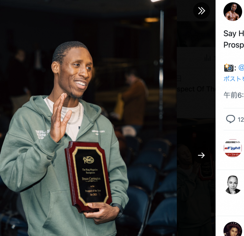 リングマガジンの『プロスペクト・オブ・ザ・イヤー2023』に選ばれたキャリントン(本人のツイッターより)
