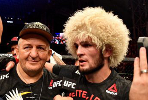 ハビブ・ヌルマゴメドフ(右)と父のアブドゥルマナプ・ヌルマゴメドフ氏(左)。事件は父の武道学校の生徒たちが起こした(C)UFC(C)Zuffa LLC/UFC