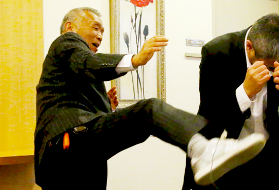石井館長はKrushの宮田充プロデューサーを相手にK-1ルール変更の提案を実演