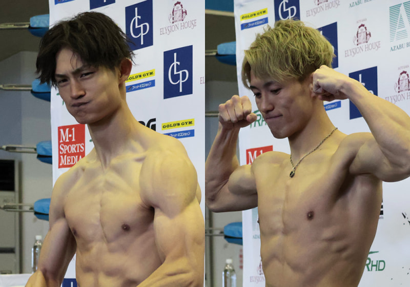 王者の髙橋(左)と挑戦者の横山がバキバキマッスルボディで計量パス