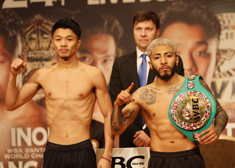 ▼WBC世界バンタム級(53.52kg)タイトルマッチ 右=アレハンドロ・サンティアゴ(メキシコ/王者)→53.4kg vs 左=中谷潤人(MT/挑戦者)→53.3kg