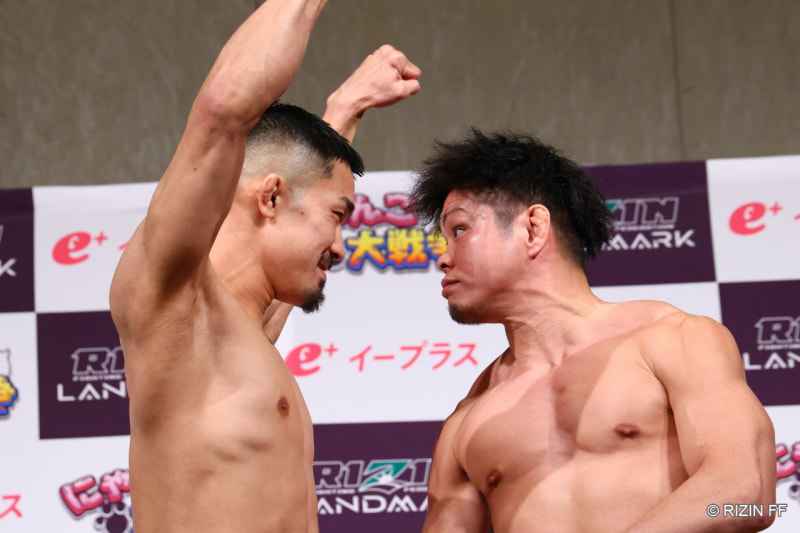 芦田(左)と鈴木が計量パスで“近距離マッスル”対決に