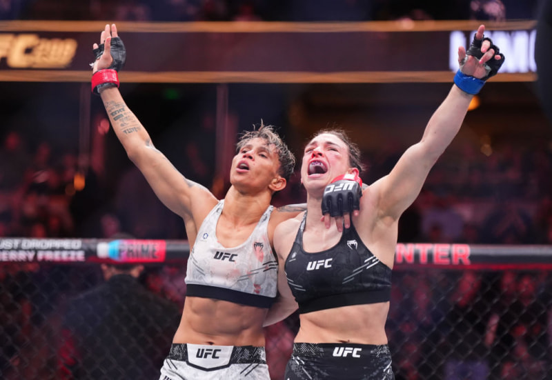 大激闘の末、お互い方を組んで両手を広げるダーン(右)とレモス(左)©️UFC