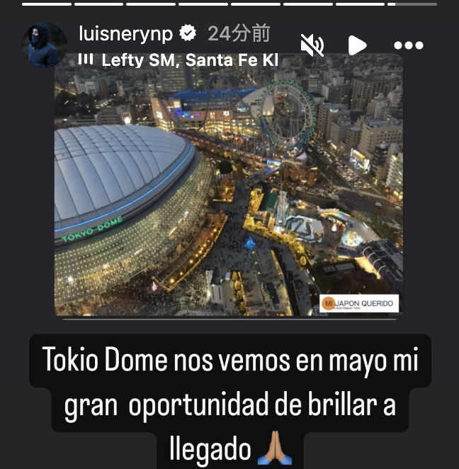 ネリが「東京ドームで会おう、輝けるときがきた」と投稿、5月ドームは確定か(本人のインスタより)